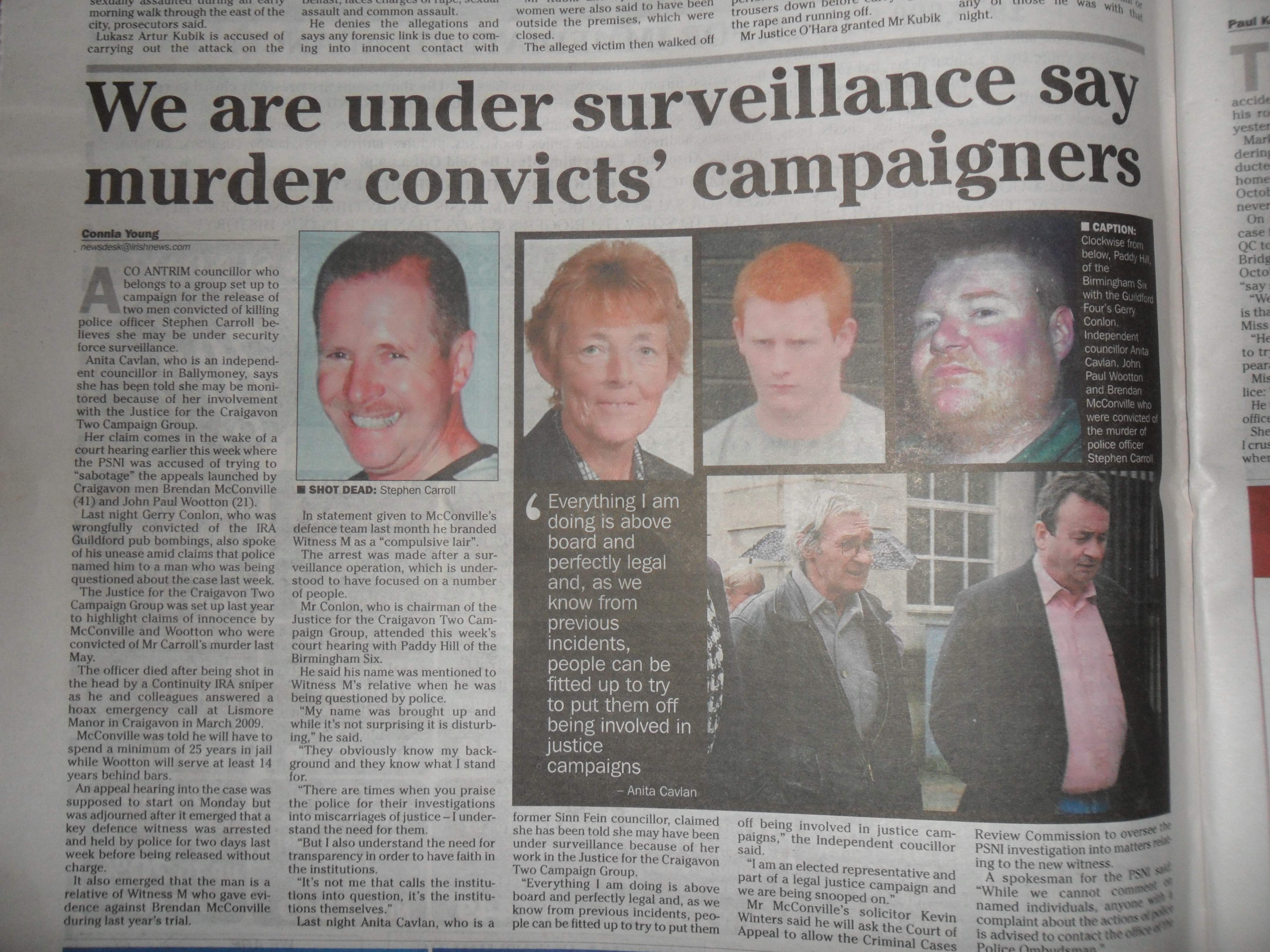 Last night Anita Cavlan, who is a former Sinn Fein councillor, claimed she has been told she may have been under surveillance because of her work in the Justice for the Craigavon Two Group. “Everything I am doing is above board and perfectly legal and, as we know from previous incidents, people can be fitted up to try to put them off being involved in justice campaigns,” the independent councillor said. “I am an elected representative and part of a legal justice campaign and we are being snooped on.”