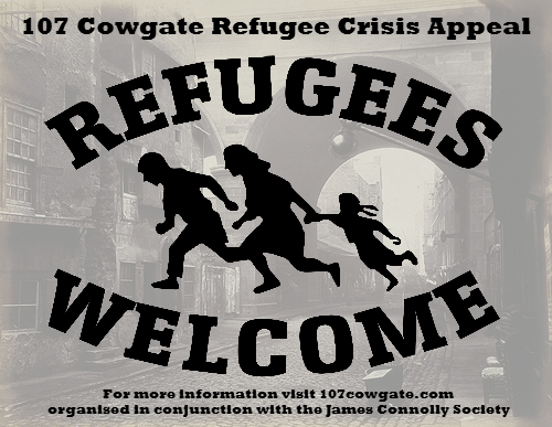 107 Cowgate in conjunction with the James Connolly Society are holding a refugee crisis appeal. 107 Cowgate is based in Edinburgh’s Old Town, the part of the city known as Little Ireland in acknowledgement of the influx of Irish refugees and immigrants to the area historically. The JCS was founded by members of that community. 107 Cowgate and the James Connolly Society welcome refugees to Edinburgh.